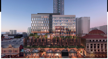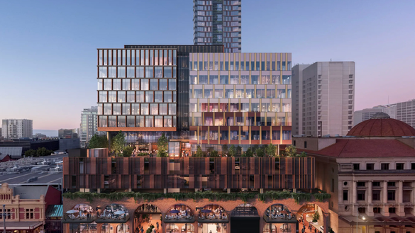 The 106,000sqm project will see the Adelaide Central Market trading floor doubled in size, below a podium building atop which sits a 13-storey office tower and a 40-storey hotel and apartment tower.