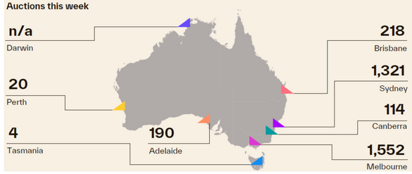 There are 114 homes set for auction in Canberra, down from 124 last week, while 20 auctions are scheduled in Perth, up from 16 last week. Four auctions are scheduled in Tasmania this week, following two weeks of inactivity.