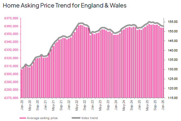 - Pricing remains very subdued. Agents are clearly pricing to sell in an increasingly challenging market. Home prices in England and Wales are just 0.5% higher than in January 2025.