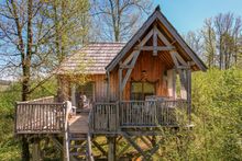 Two elevated treehouse cabins sit among the trees and include large terraces and Nordic hot tubs, creating the atmosphere of a secluded forest hideaway.