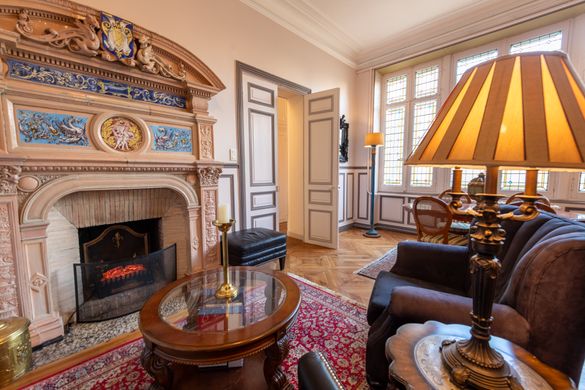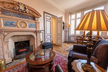 The apartment combines generous proportions with classic French character, featuring herringbone parquet flooring, decorative mouldings, stained glass and several marble fireplaces. The layout includes a bright living room, second sitting room, library, two offices, two spacious bedrooms, kitchen, bathroom, guest WC, dressing areas, built-in storage, balcony, cellar and independent storage room.